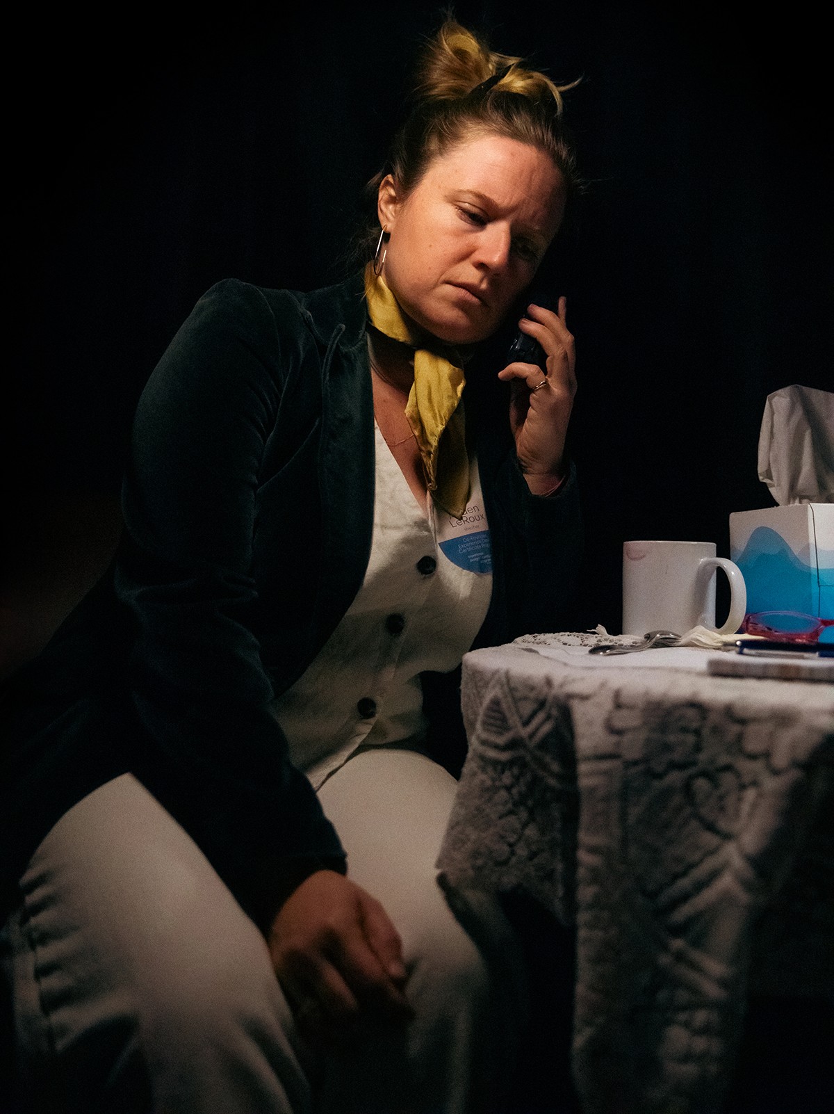 The audience is invited into a dark space, a table is lit, and they are invited to sit and listen. The table is strewn with the daily ephemera of life. Nail polish remover, a coffee cup with a lipstick on the rim, some hershey kisses.